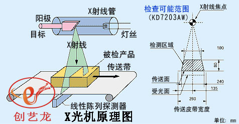 X射線安全檢查設備是借助于傳送帶將被檢查行李送入履帶式通道完成的。行李進入通道后,將阻擋光障信號,檢測信號被送至控制單元,觸發射線源發射 X 射線束。一束經過準直器的非常窄的扇形 X 射線束穿透傳送帶上的行李物品落到雙能量探測器上,高效半導體探測器把接收到的 X 射線變為電信號,這些很弱的電流信號被直接量化,通過通用串行總線傳送到工業控制計算機作進一步處理,經過復雜的運算和成像處理后得到高質量的圖像。